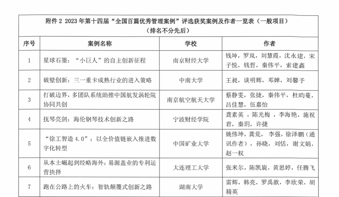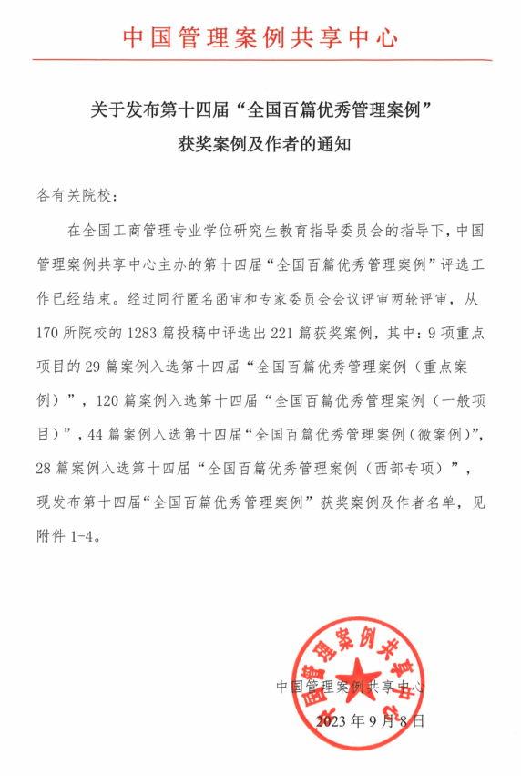 本届评选于2023年3月30日启动,共收到来自全国170所院校的1283篇投稿。通过专家匿名函评和专家会议评审两个环节,最终确定9所院校的9个项目29篇案例入选第十四届“全国百篇优秀管理案例(重点案例)”,68所院校的120篇案例入选第十四届“全国百篇优秀管理案例(一般项目)”,31所院校的44篇案例入选第十四届“全国百篇优秀管理案例(微案例)”,13所院校的28篇案例入选第十四届“全国百篇优秀管理案例(西部专项)”。