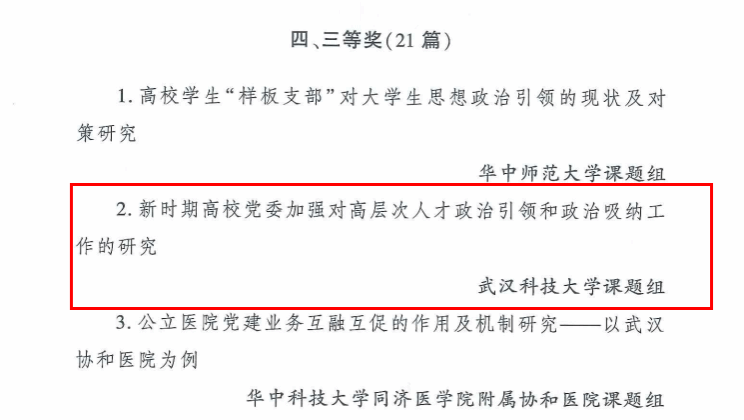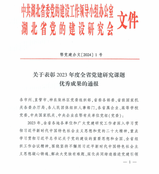 近日,中共湖北省委党的建设工作领导小组办公室、湖北省党的建设研究会印发《关于表彰2023年度全省党建研究课题优秀成果的通报》,由党委巡察办主任(时任必赢766net手机版党委副书记)毛晓丹主持的课题《新时期高校党委加强对高层次人才政治引领和政治吸纳工作的研究》荣获2023年度全省党建研究课题优秀成果“三等奖”。