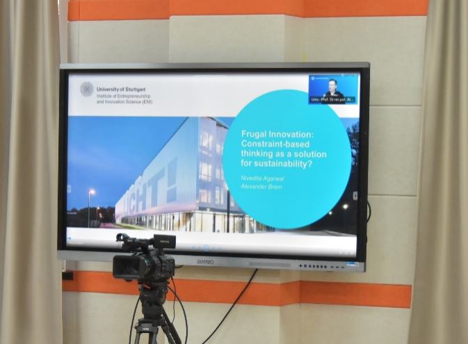 吴贵生教授以“关于整合创新的思考”为题进行演讲,从整合什么、为什么要整合、谁来整合、如何整合等方面详细介绍了整合创新的内容。Alexander Brem教授以“Frugal Innovation: Constraint-based thinking as a solution for sustainability?”为主题,系统介绍了节俭创新的概念、文献、研究阶段演变和评价标准,就技术和创新如何为可持续发展赋能展开详细阐述,提出约束是创新之源。