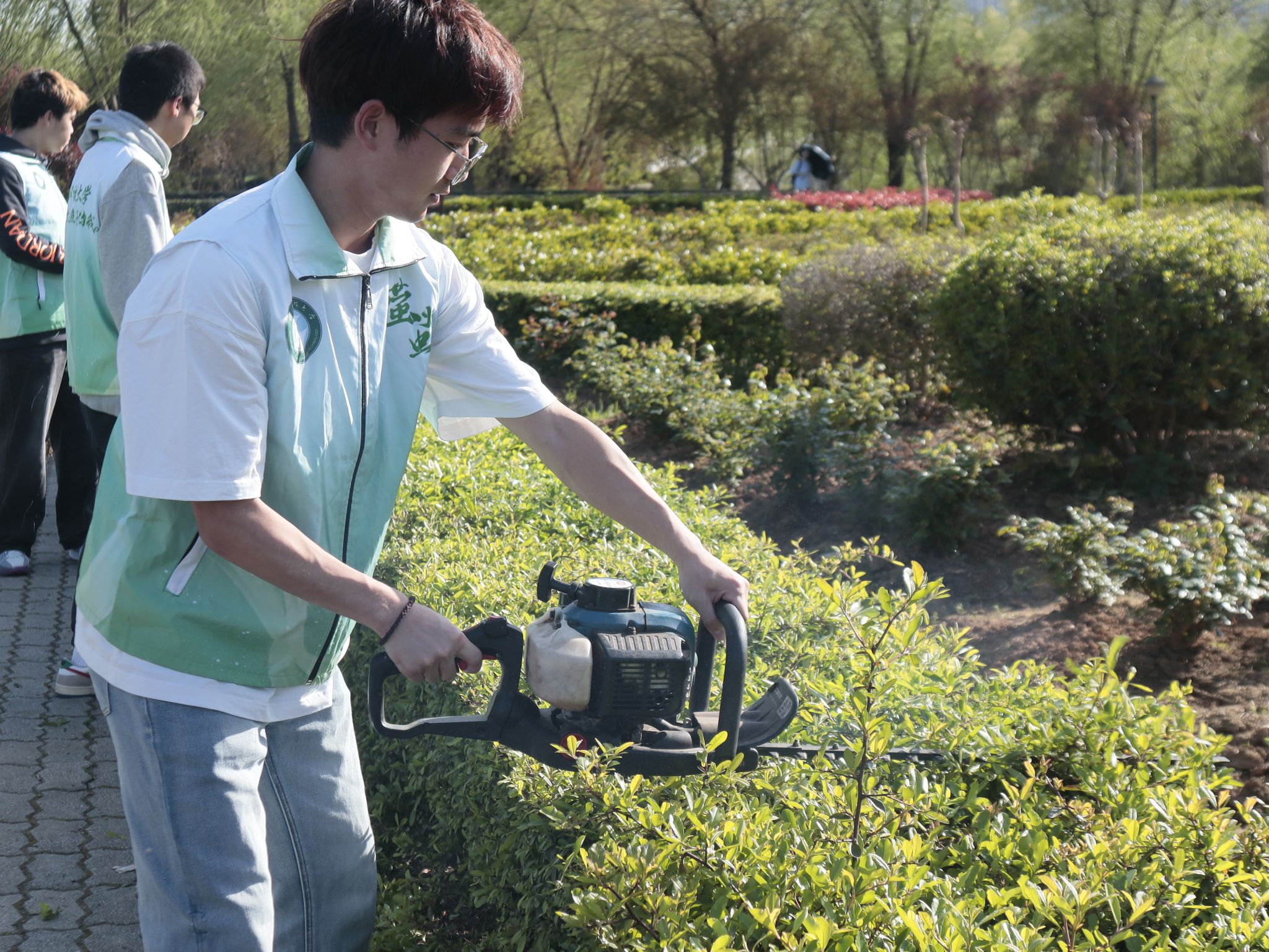 活动伊始,后勤保障部园林维护员向学生们细致地讲解了应如何正确握住电锯,以及树丛中哪些部分需要修剪,并亲自演示正确的操作方法。郭恺茗主动实践,干练地修剪了一片树丛。“这位小伙子真不错。”一旁的师傅表示道,轻松地活跃了修剪现场的氛围。学生们分工协作,修剪树枝之余,将地上的碎枝叶扫到树丛边,保证了校园小路的干净整洁。